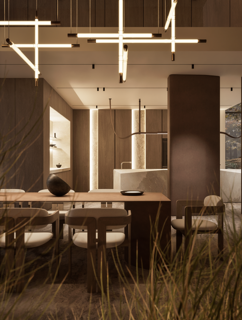 Gdzie las spotyka wnętrze. Ogromne okna, skalne dekory i naturalne materiały stapiają się z otoczeniem, tworząc przestrzeń, która pozwala poczuć dzikość natury w nowoczesnym wydaniu. Drewno, szkło, kamień i skóra – surowość w harmonii z ciszą. Tu minimalizm oddaje głos przyrodzie.